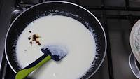 - Now add the milk in which gelling powder is dissolved to 'not very hot' heavy cream. Mix well. Be quick!